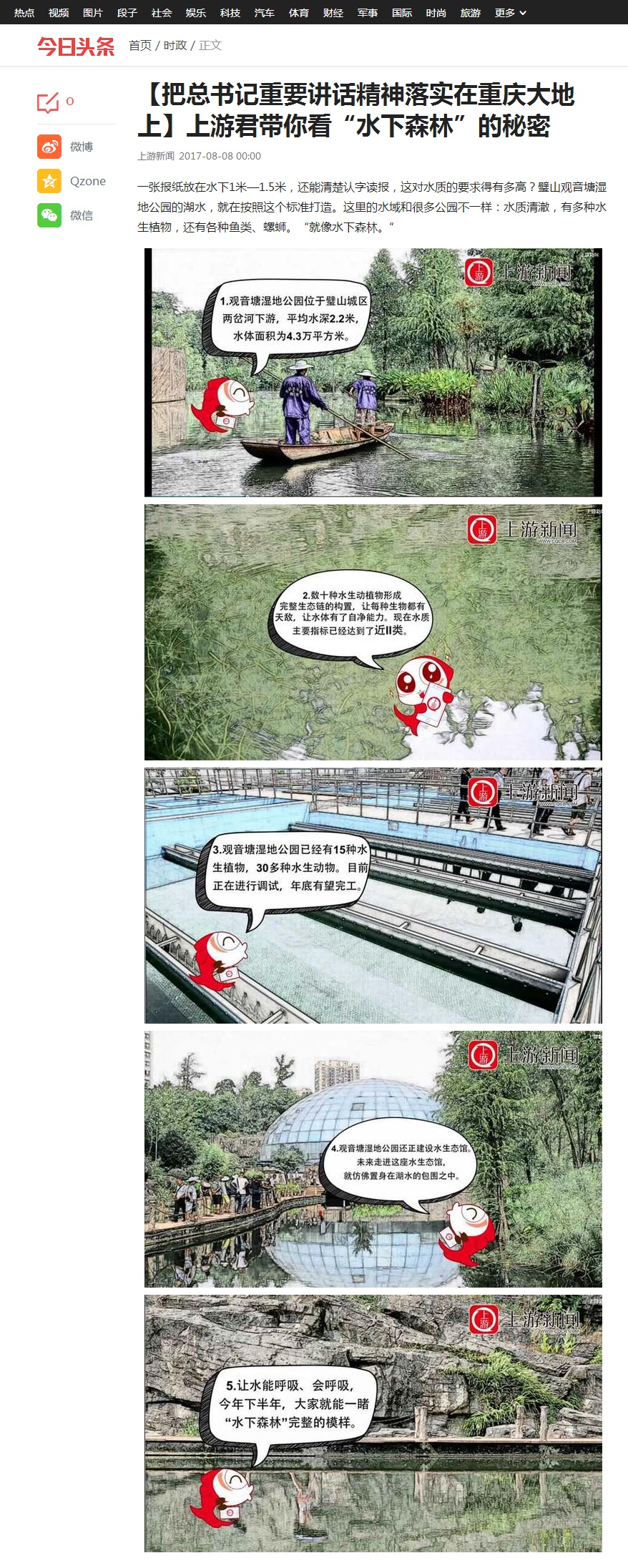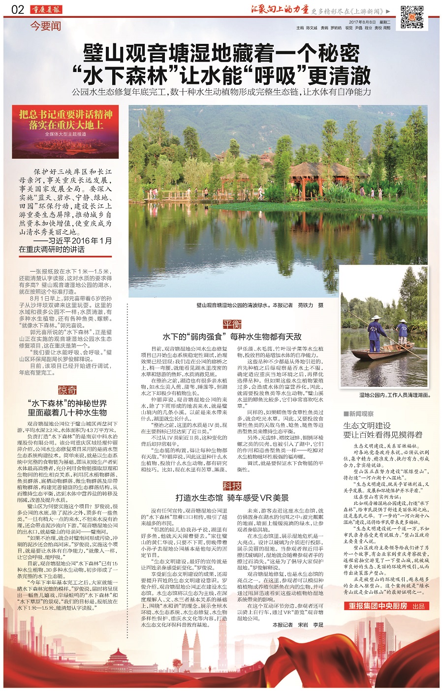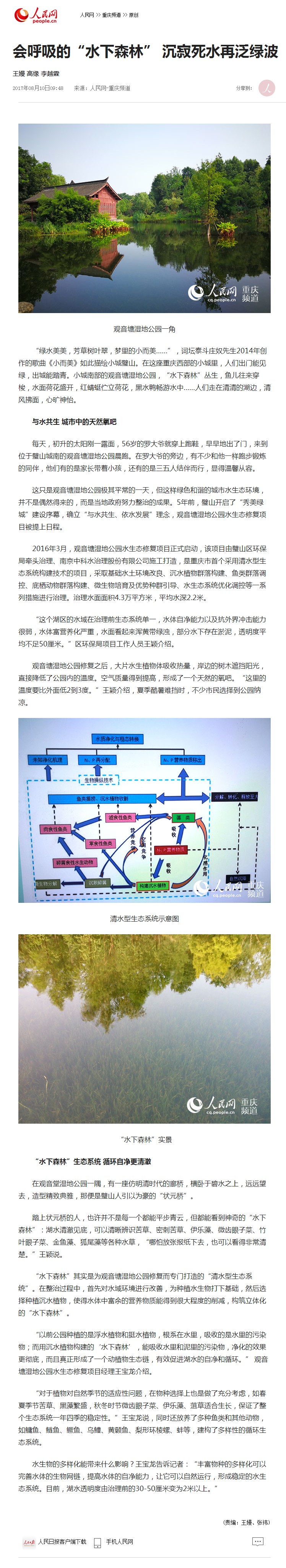 重慶日報、重慶之聲、重慶電視臺、重慶晚報、重慶晨報、重慶商報、華龍網(wǎng)、《當代黨員》雜志社等市級主流媒體記者,來到觀音塘濕地公園,實地探訪了“水下森林”建設(shè)情況,采訪了項目設(shè)計施工單位【南京中科水治理股份有限公司】工作人員。觀音塘濕地公園項目是由中科水治理傾力打造的精品水生態(tài)修復項目,也是重慶市首個生態(tài)文明建設(shè)示范基地。