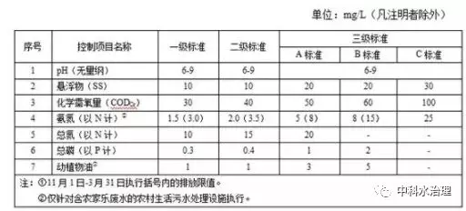 出水排入其他水體時,執(zhí)行表1中三級標準。其中,規(guī)模500m3/d(不含)-50m3/d(含)的處理設(shè)施執(zhí)行A標準;規(guī)模50m3/d(不含)-10m3/d(含)的處理設(shè)施執(zhí)行B標準;規(guī)模小于10m3/d(不含)的處理設(shè)施執(zhí)行C標準。