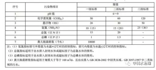 規(guī)模小于 5m3 /d(不含)且出水排入 GB 3838-2002 中Ⅳ類、Ⅴ類水域和其他未劃定水環(huán)境功能區(qū) 的水域、溝渠、天然濕地,以及 GB 3097-1997 中三、四類海域的污水,執(zhí)行表 1、表 2 三級標準對應(yīng) 的排放濃度限值。