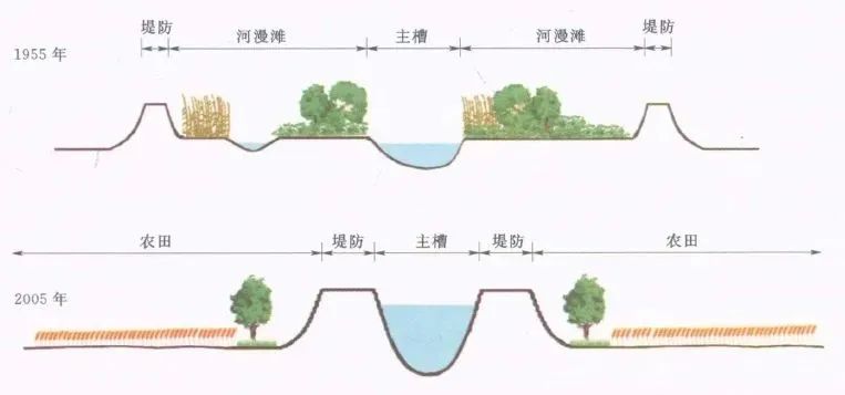 ▲圍墾河漫灘+堤防縮窄河道示意圖